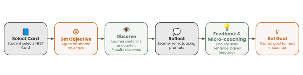 A visual map demonstrating how faculty and learners use NEST tools throughout the clinical encounter—aligning goals, observing performance, engaging in reflection and coaching, and setting actionable growth goals. This workflow highlights NEST’s feasibility, low-burden integration, and alignment with CBME.