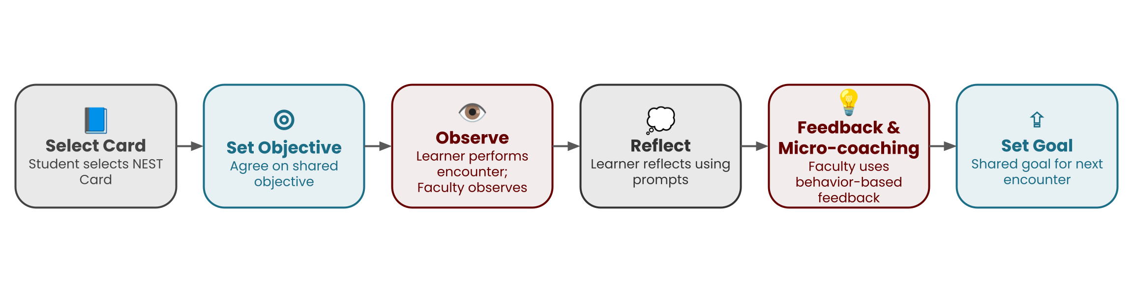 A visual map demonstrating how faculty and learners use NEST tools throughout the clinical encounter—aligning goals, observing performance, engaging in reflection and coaching, and setting actionable growth goals. This workflow highlights NEST’s feasibility, low-burden integration, and alignment with CBME.