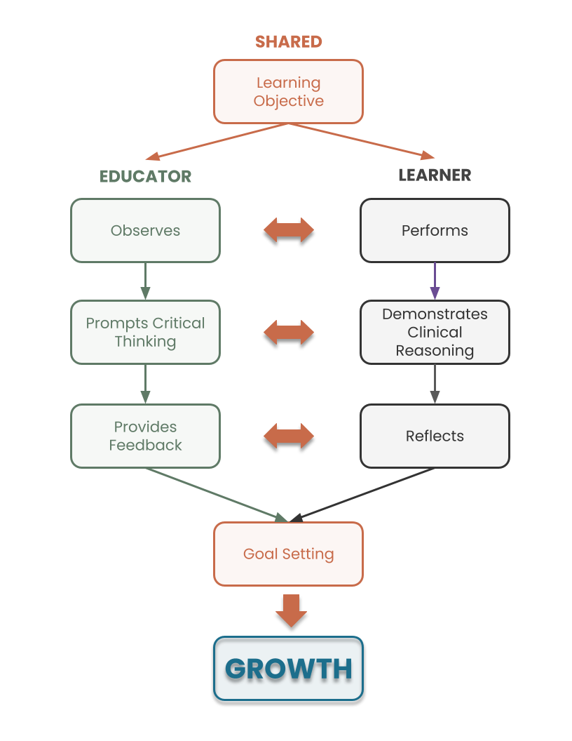 A five-step model integrating shared goals, focused observation, learner reflection, behavior-based feedback, and goal setting. The framework supports feedback literacy, coaching literacy, and competency-based growth during real clinical encounters.